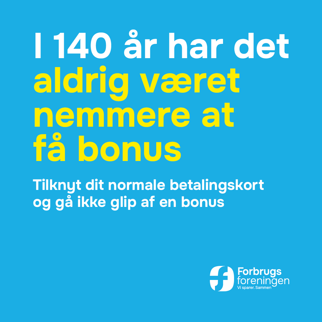Så er Forbrugsforeningen en fordelsklub for dig. Siden 1886 har Forbrugsforeningen arbejdet for, at din hverdag skal koste mindre. Derfor får du som medlem bonus, hver gang du handler i flere tusind danske butikker, webshops og restauranter. Det gør du, fordi hele fagbevægelsen har forenet købekraften ét sted, så vi sammen optjener bonus, hver gang vi handler i hverdagen – uanset om det er dagligvarer, oplevelser eller croissanter til kaffen.